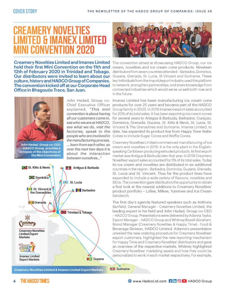 Creamery Novelties Limited and Imanex Limited held their first Mini Convention on the 11th and 12th of February 2020 in Trinidad and Tobago. Our distributors were invited to learn about our culture, history and HADOC Group of Companies. The conversation kicked off at our Corporate Head Office in Bhagoutie Trace, San Juan.